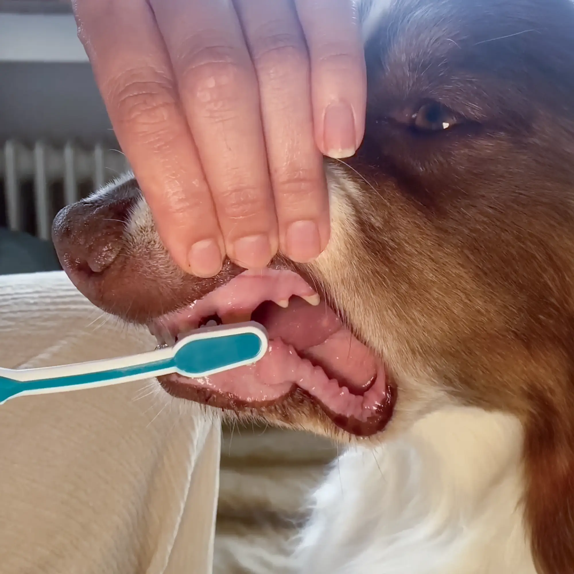 - Kurze und regelmäßige Anwendungen: Putze zuerst nur wenige Zähne und erhöhe schrittweise die Dauer und den Bereich der Zahnreinigung. Putzen Sie die Zähne Ihres Hundes täglich, um ihn an die Zahnpflege zu gewöhnen.