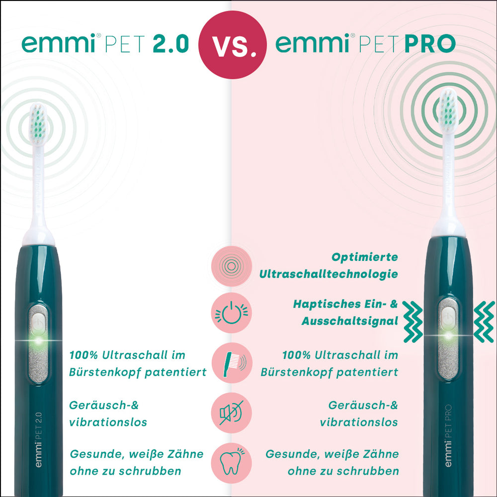Erlebe mit der neuen emmi-pet PRO die nächste Generation der Hundezahnbürsten mit 100% Ultraschall – jetzt mit innovativen Funktionen, die die Zahnpflege für dein Haustier noch einfacher und effektiver machen. Die optimierte Technologie sorgt für maximale Reinigungsleistung, während dein Vierbeiner weiterhin eine stressfreie, sanfte Erfahrung genießt.