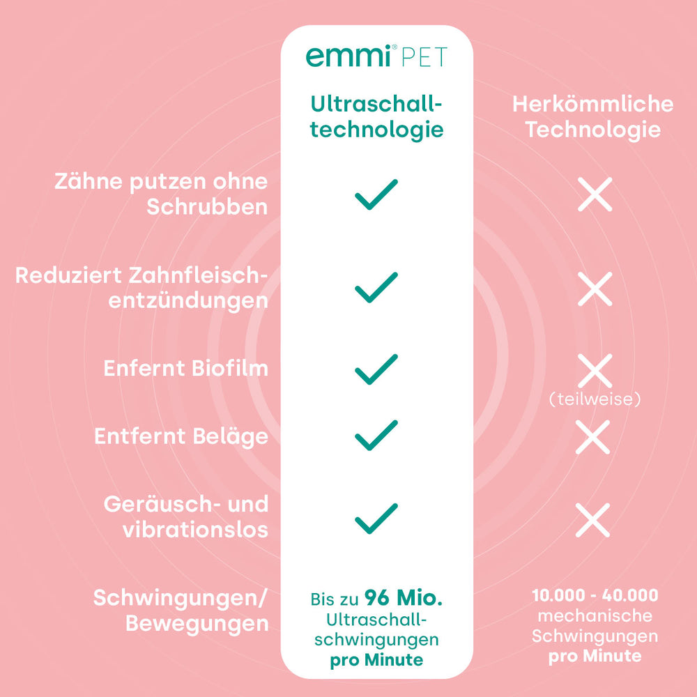 Fingerlinge und Fingerbürsten reinigen nur mechanisch und erreichen oft nicht die Zahnfleischtaschen, wo sich Bakterien ansammeln. Gerade bei Zahnfleischentzündungen reiben Fingerlinge am gereizten Zahnfleisch und können die Entzündung verschlimmern. Die emmi-pet Ultraschallzahnbürste für Hunde arbeitet mit 100% Ultraschall, reinigt gründlich bis in die Tiefe – ganz ohne Reiben oder Druck. Das macht sie besonders schonend für Zähne und Zahnfleisch deines Hundes.