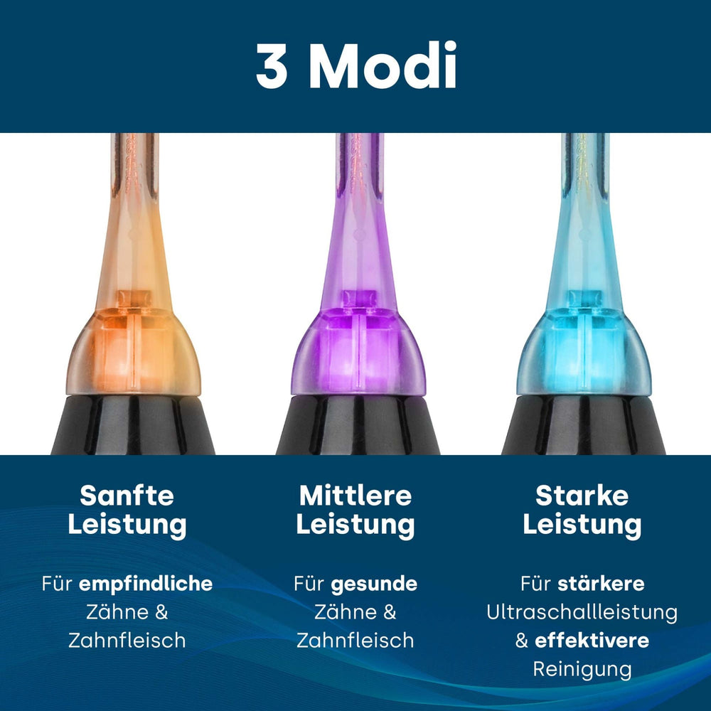 • 3 Reinigungsmodi: Wählen Sie zwischen sanfter, mittlerer und starker Leistung – individuell abgestimmt auf Ihre Zahngesundheit.