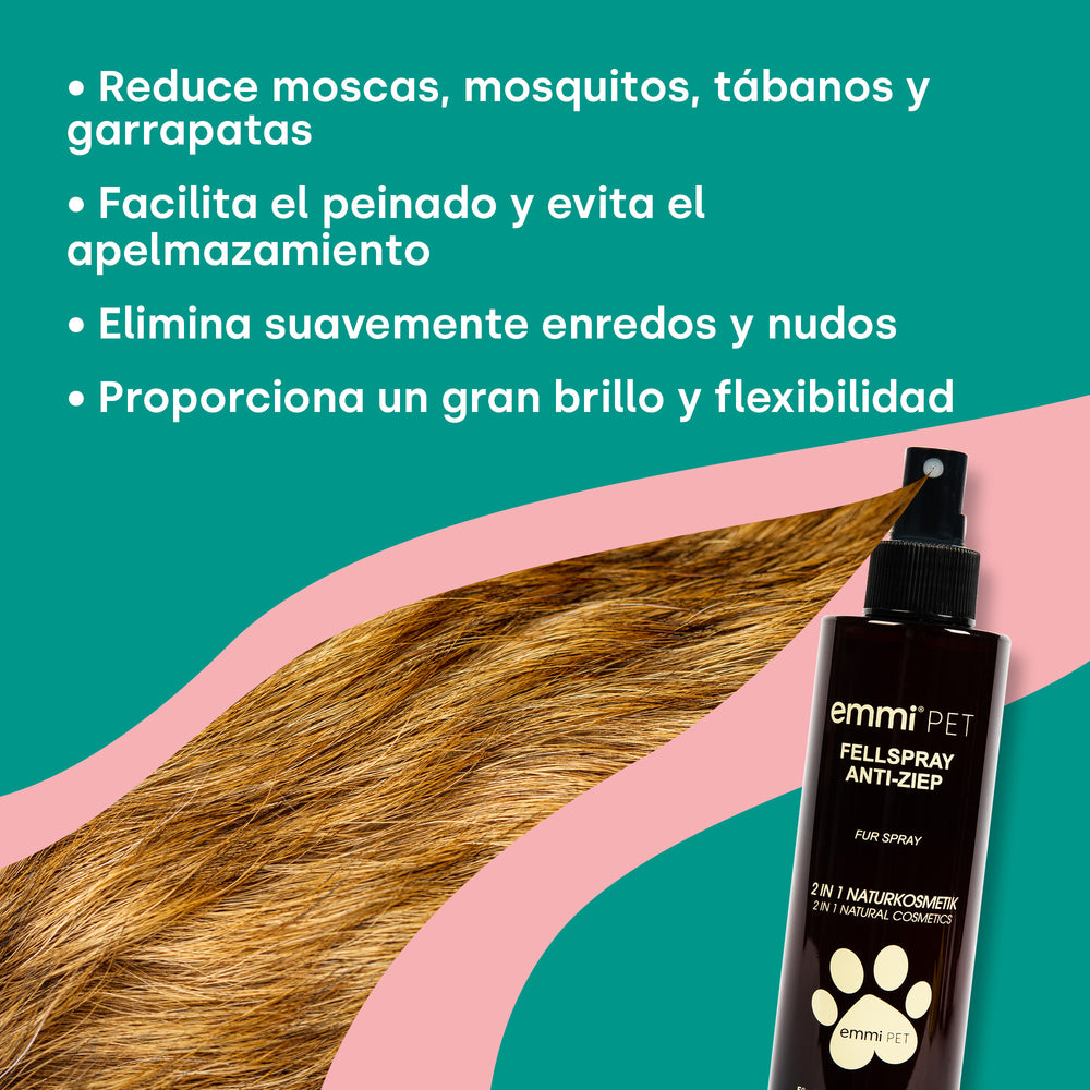 With the Anti-Tangle Natural Coat Spray, pulling brushing is a thing of the past. The 100% natural formula makes combing easier, moisturizes, strengthens the hair structure and protects against external influences – for a silky soft, supple coat.
