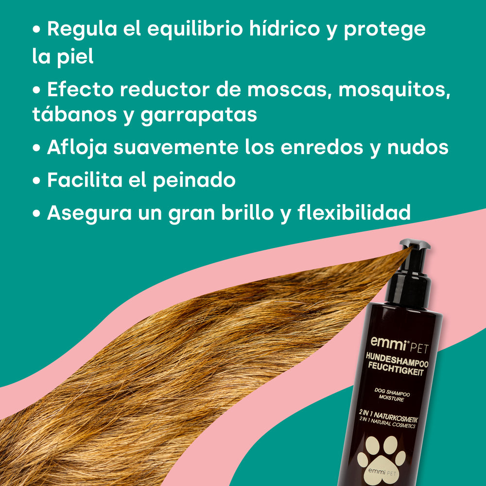 emmi-PET Moisture Natural Dog Shampoo thoroughly cleanses skin and coat without drying them out. The plant-based formula with moisturizing extracts of aloe vera, herbs, sea buckthorn oil, and lemon eucalyptus supports the skin's natural protective barrier, provides a healthy shine, and makes the coat easier to comb – ideal for sensitive dogs and puppies from 10 weeks of age.