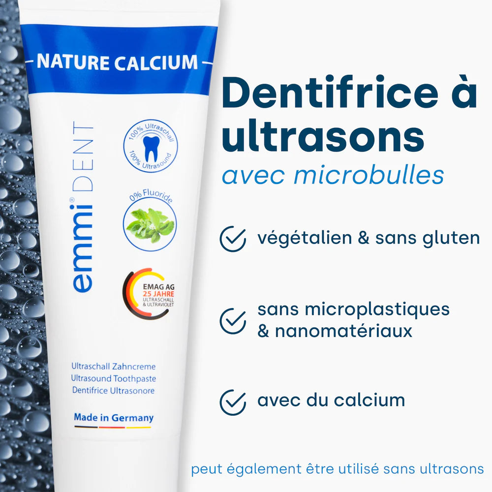 Ne manquez pas l'opportunité emmi-dent Essayez le dentifrice ultrasonique Nature Calcium et renforcez vos dents naturellement. Commandez dès aujourd'hui et profitez des bienfaits de soins dentaires de haute qualité sans fluor, mais avec la puissance du calcium.