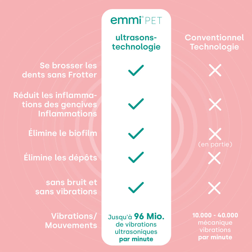 La brosse à dents à ultrasons Emmi Pet est une option douce et silencieuse pour les soins dentaires du chien.Grâce à la technologie des ultrasons, qui génère jusqu'à 96 millions de vibrations par minute, le brossage des dents est possible sans aucun frottement.