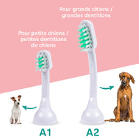 La brosse à dents à échographie Emmi pour animaux de compagnie convient également aux petits chiens et peut être utilisée chez les jeunes animaux car il est livré avec une petite tête de pinceau spécialement conçue.