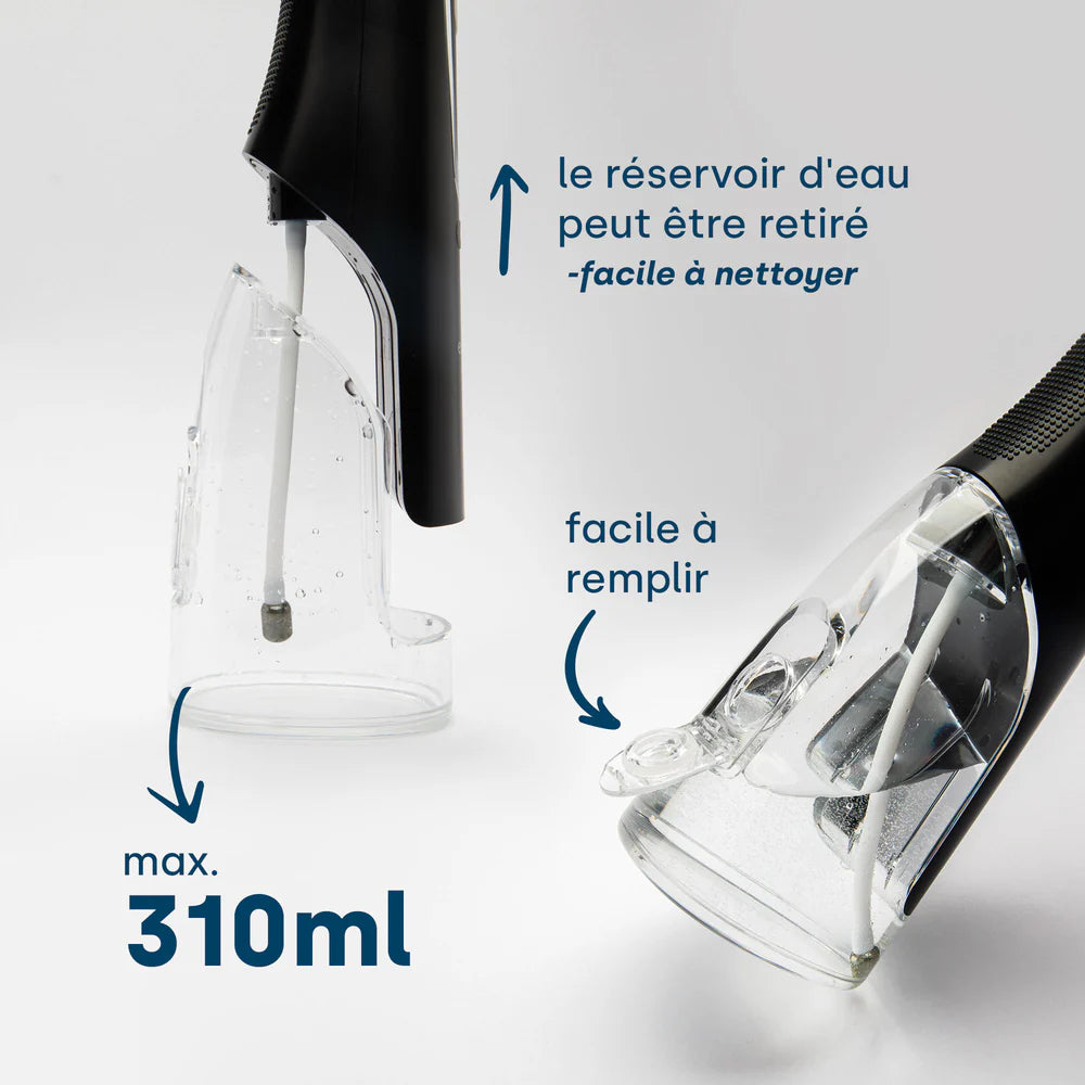 L'irrigateur buccal est étanche selon la norme IPX7 et peut être utilisé à la maison ou en voyage. Le réservoir intégré de 300 ml peut être facilement retiré pour le nettoyage. La buse peut également être facilement retirée pour changer les accessoires.