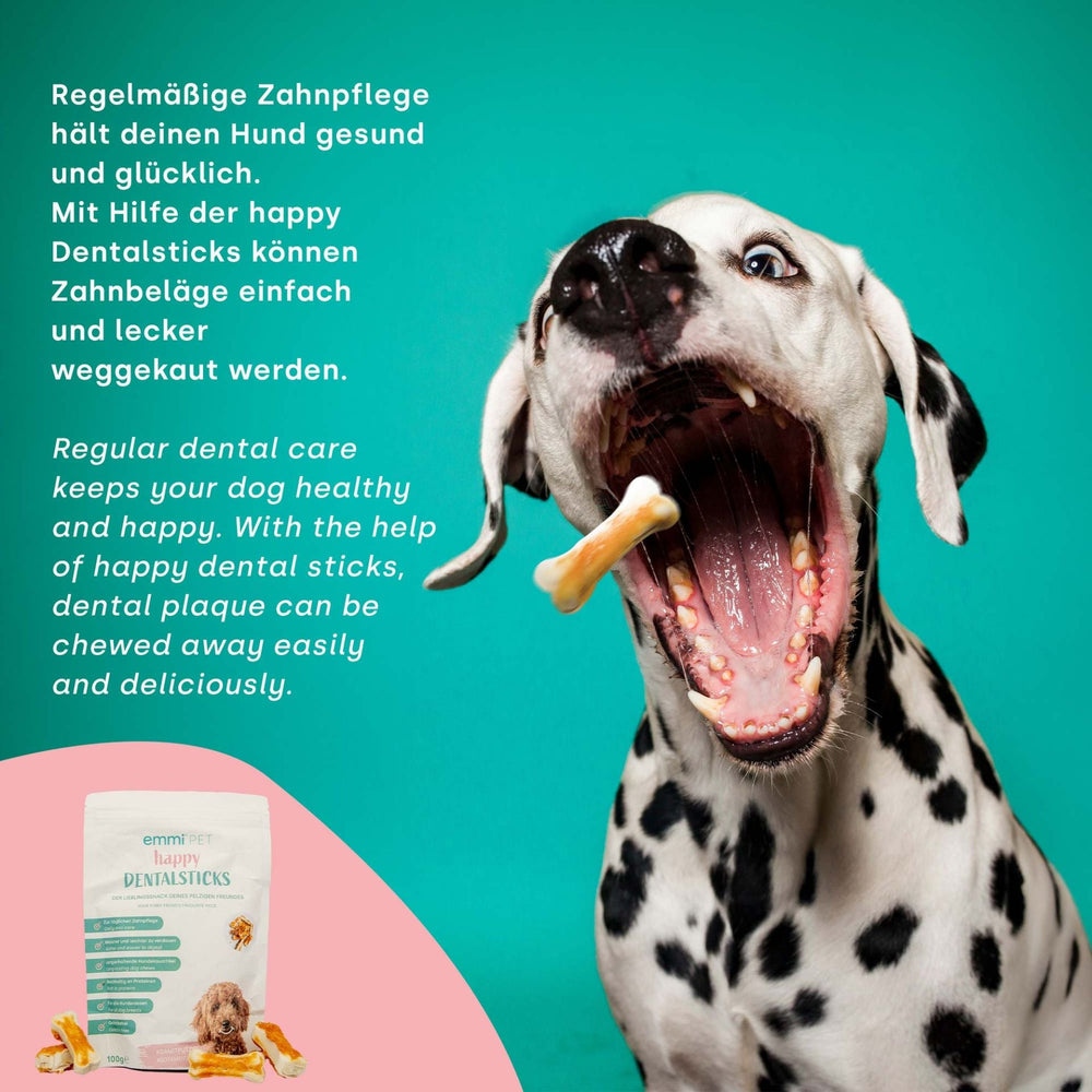 Les bâtonnets « Power Dental » d'emmi-pet favorisent les soins dentaires et l'hygiène bucco-dentaire de votre chien grâce à la mastication. Les bâtonnets réduisent la plaque dentaire et renforcent les gencives–un soutien simple pour des dents saines et un nettoyage dentaire de votre chien. Saviez-vous ? Après avoir mangé, vous pouvez simplement donner à votre compagnon à quatre pattes l'un de nos bâtonnets dentaires pour éliminer les résidus alimentaires et réduire la plaque dentaire.
