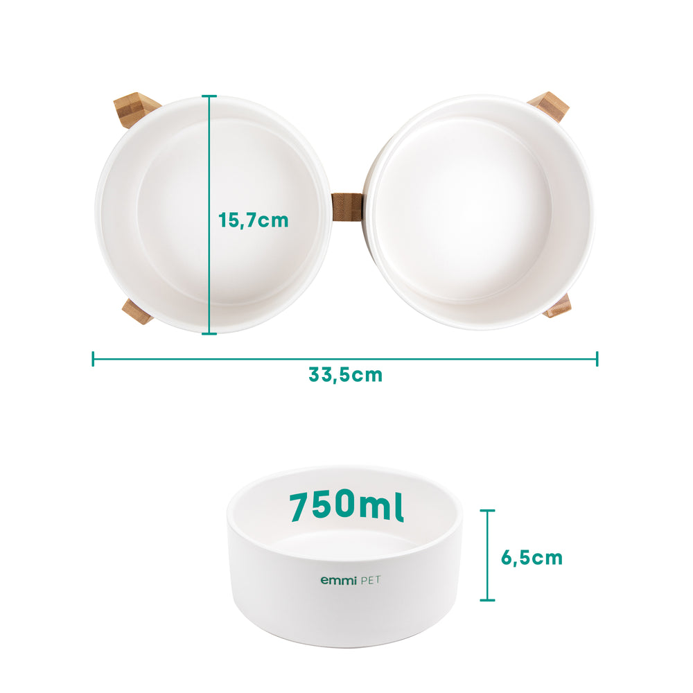 Le emmi-animal de compagnie Le bol d'eau et de nourriture en un est fabriqué en céramique de haute qualité et offre une solution pratique et peu encombrante pour nourrir votre chien. Pour résister à une utilisation quotidienne, il est très robuste et assure une longue durée de vie. Le poids agréable des deux bols et le cadre en bois assorti assurent la stabilité et garantissent le plaisir de la ration alimentaire quotidienne. Le lisse La surface des gamelles pour chien facilite l'entretien et l'hygiène quotidiens. Ils peuvent être lavés à la main ou nettoyés au lave-vaisselle. Grâce à la base antidérapante, les bols en céramique restent stables sur le sol et évitent ainsi qu'ils ne se renversent. Cela minimise les déversements et garantit un environnement propre. Le cadre en bois est recouvert de vernis pour le protéger de l'eau. La barre d'alimentation pour petits et grands chiens est un accroche-regard pour chaque propriétaire d'animal grâce à son look moderne.