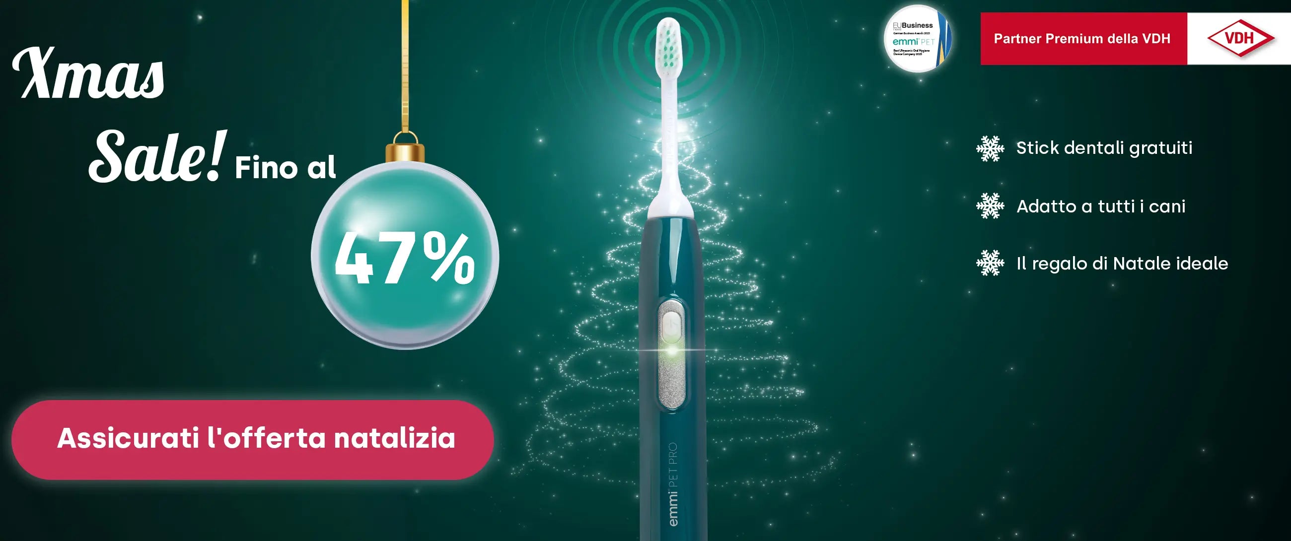 Tuttavia, l'uso di uno spazzolino a ultrasuoni non sostituisce una visita dal veterinario. I problemi dentali devono essere trattati da un professionista affinché il tuo cane non provi dolore e nulla impedisca la pulizia dei denti con uno spazzolino per cani Emmi-Pet. Consigliamo il nostro Emmi-Pet per la profilassi o la prevenzione.