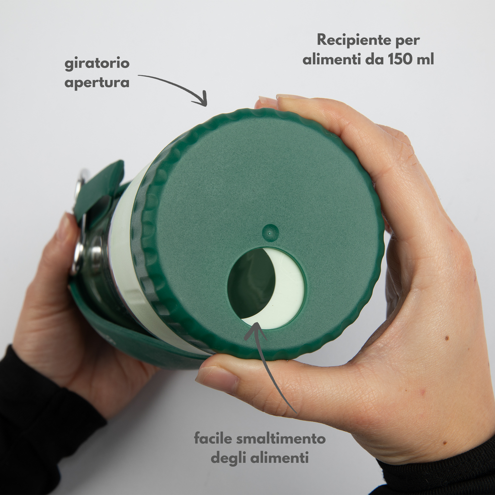 • Contenitore per snack integrato: 150 ml extra per cibo o spuntini: perfetti per piccole ricompense da portare sempre con sé.