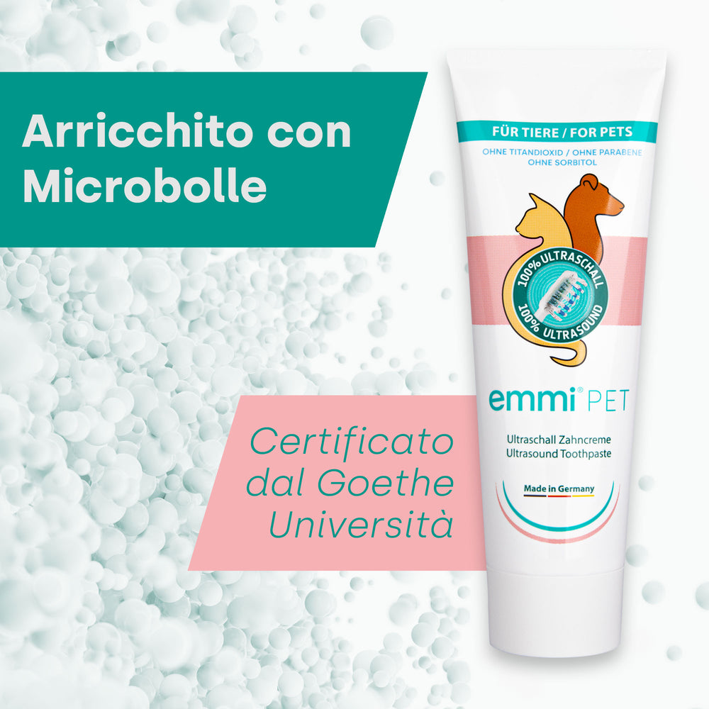 Il dentifricio ultrasonico Emmi-pet è stato sviluppato per garantire i massimi standard di cura dei denti in combinazione con lo spazzolino ultrasonico Emmi-pet. L'applicazione di ultrasuoni originali al 100% crea un effetto di pulizia unico, ottenuto attraverso la formazione di milioni di microbolle. Queste microbolle penetrano in profondità negli spazi interdentali e nelle fessure più piccole per rimuovere efficacemente biofilm, contaminanti e batteri.