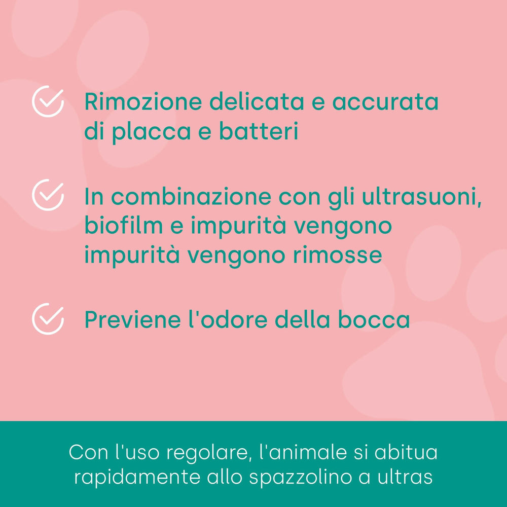 Il dentifricio ad ultrasuoni emmi-pet per animali offre numerosi vantaggi che lo rendono un'ottima scelta per la cura dei denti del tuo animale domestico: Pulizia delicata senza abrasione: grazie agli ultrasuoni, non è più necessario spazzolare i denti in modo aggressivo. Il valore RDA (abrasione relativa della dentina) è 0, il che significa che il dentifricio è particolarmente delicato sullo smalto e sulle gengive del tuo animale domestico. Rimozione efficace di biofilm e batteri: la tecnologia a microbolle garantisce la rimozione anche della placca e dei batteri più ostinati, senza sollecitare meccanicamente i denti. Prevenzione delle malattie dei denti e delle gengive: una pulizia delicata ma accurata preserva le funzioni protettive naturali dei denti, riducendo significativamente il rischio di malattie dei denti e delle gengive. Combattere l'alito cattivo: l'uso regolare del dentifricio Emmi-Pet aiuta a prevenire l'alito cattivo riducendo il numero di batteri che causano cattivi odori.