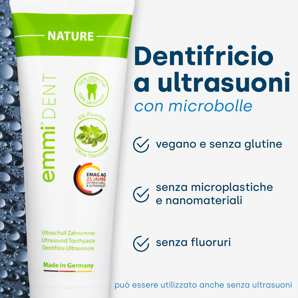 A emmi-dent Diamo grande importanza alla qualità e alla naturalezza. Il nostro dentifricio Nature Ultrasonic contiene ingredienti naturali accuratamente selezionati che si prendono cura e proteggono efficacemente i tuoi denti. Fidati di emmi-dent e goditi i vantaggi di cure odontoiatriche di alta qualità, senza fluoro e biossido di titanio.