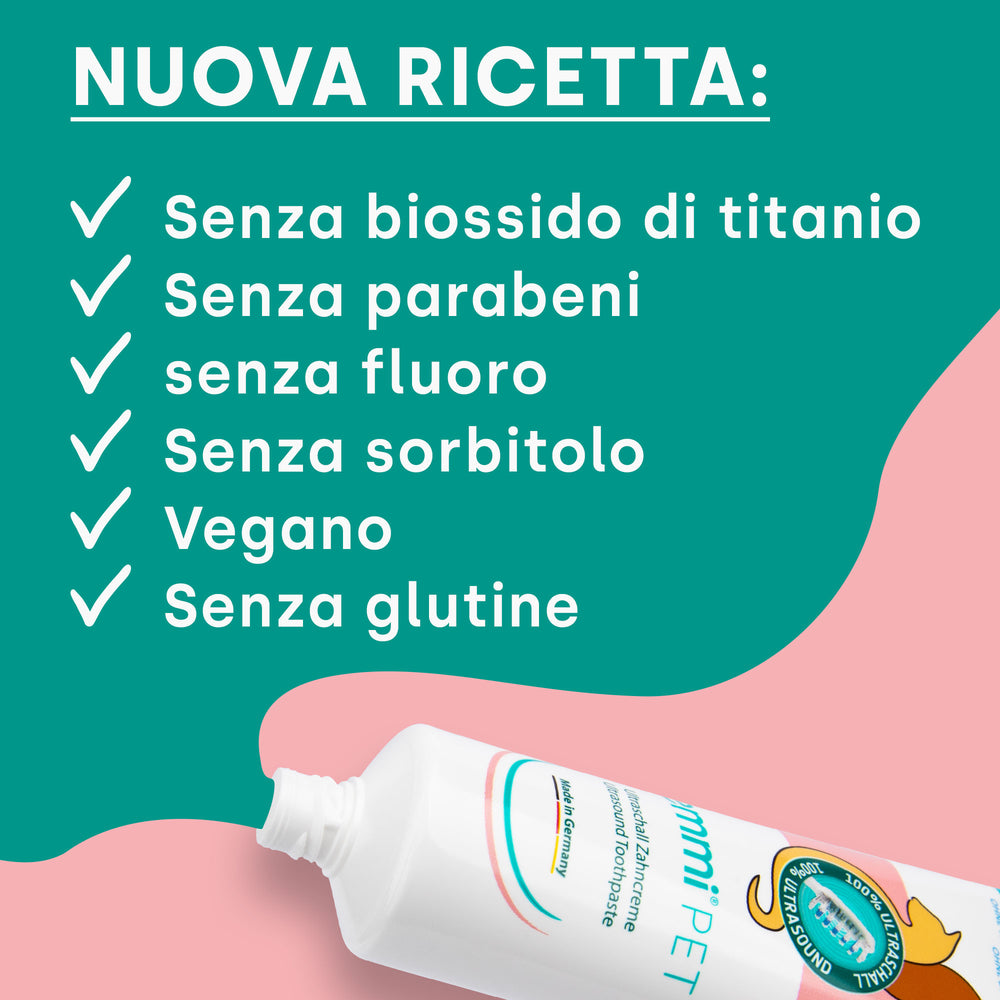 Il dentifricio ad ultrasuoni emmi-pet per animali offre numerosi vantaggi che lo rendono un'ottima scelta per la cura dei denti del tuo animale domestico: Pulizia delicata senza abrasione: grazie agli ultrasuoni, non è più necessario spazzolare i denti in modo aggressivo. Il valore RDA (abrasione relativa della dentina) è 0, il che significa che il dentifricio è particolarmente delicato sullo smalto e sulle gengive del tuo animale domestico. Rimozione efficace di biofilm e batteri: la tecnologia a microbolle garantisce la rimozione anche della placca e dei batteri più ostinati, senza sollecitare meccanicamente i denti. Prevenzione delle malattie dei denti e delle gengive: una pulizia delicata ma accurata preserva le funzioni protettive naturali dei denti, riducendo significativamente il rischio di malattie dei denti e delle gengive. Combattere l'alito cattivo: l'uso regolare del dentifricio Emmi-Pet aiuta a prevenire l'alito cattivo riducendo il numero di batteri che causano cattivi odori.