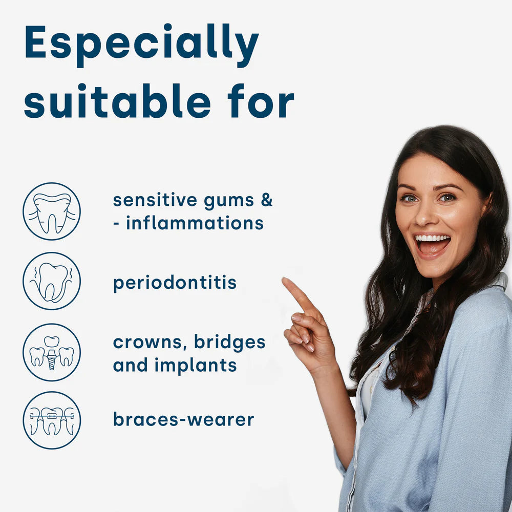 The emmi-dent The Platinum ultrasonic toothbrush is especially recommended for people who need and prefer a particularly thorough cleaning, such as those suffering from gingivitis, periodontitis, or other dental conditions. Using ultrasonic technology, the vibrations penetrate deep into the interdental spaces and gums to clean even in hard-to-reach areas, effectively preventing cavities, plaque, and gingivitis.