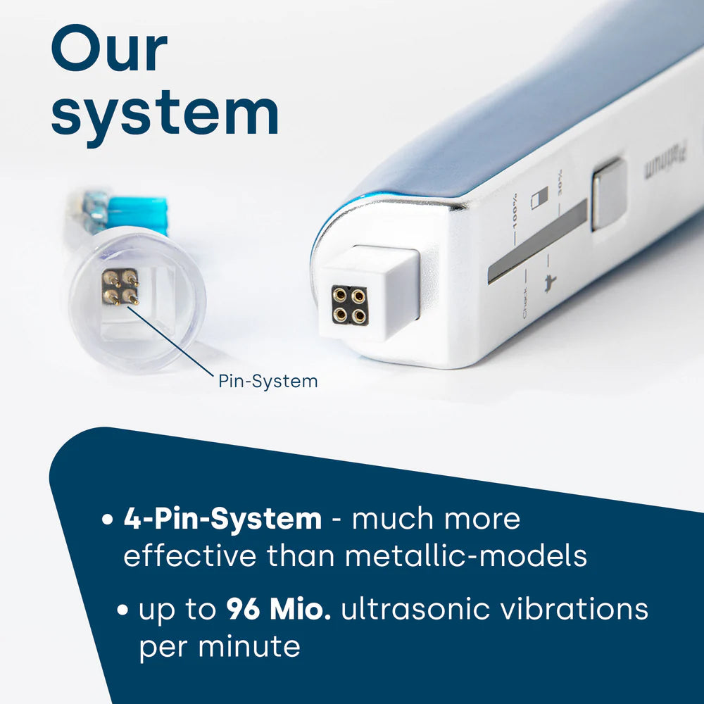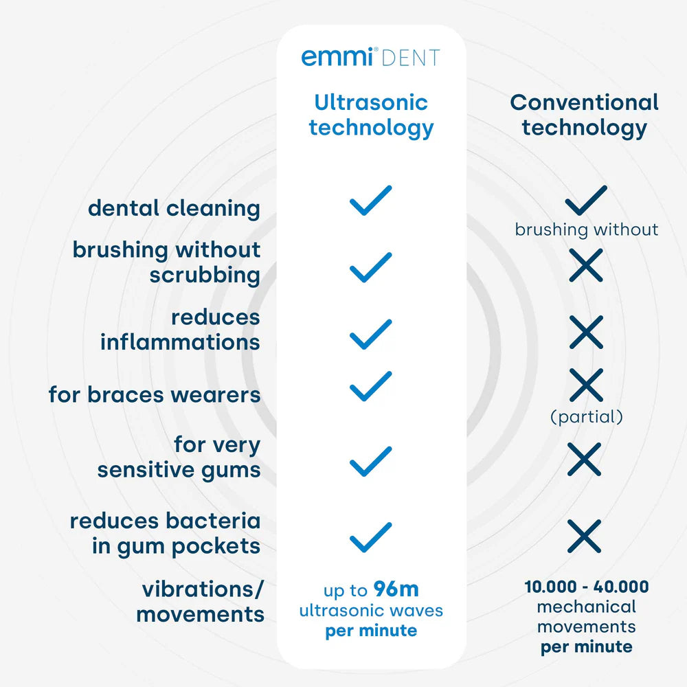 Compared to conventional electric toothbrushes, the emmi-dent Platinum Ultrasonic Toothbrush provides deep and effective cleaning by using ultrasonic waves to reduce bacteria and plaque.