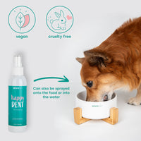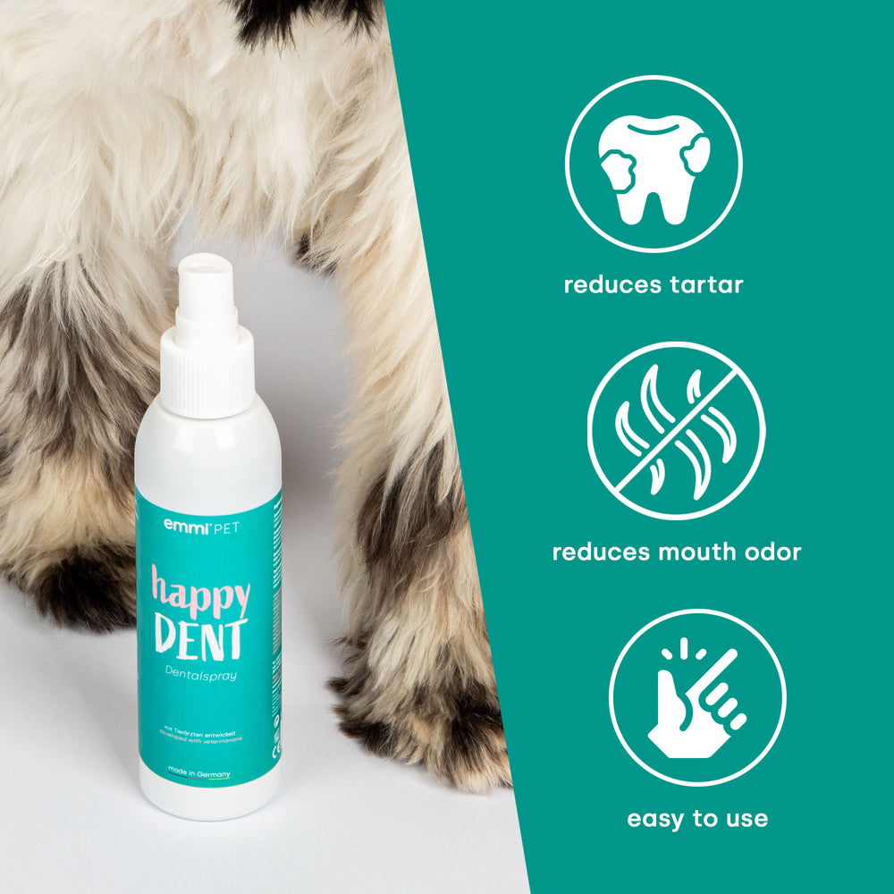 The Happy DENT dental spray is the ideal solution for fresh breath and effectively prevents tartar. Easy to use, it fights bacteria and plaque that can cause tooth decay and gum problems. Whether in the office, in the car or when traveling, with the Happy DENT dental spray you always have a quick and practical solution for your four-legged friend's oral hygiene at hand.