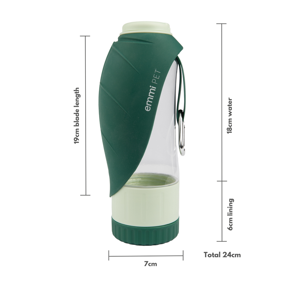 Dogs need a lot of water when they are exerting themselves or in hot weather. When travelling or on a walk, it is sometimes not easy to provide your four-legged friend with fresh water. When you are out and about, it is not surprising if your pet gets thirsty and drinks from puddles or ponds. But the water can contain germs and lead to digestive problems. That is why emmi-pet dog drinking bottle the ideal solution for on the go. With the emmi-pet dog drinking bottle 2in1 you always have plenty of water at hand. By simply folding the leaf, the pet drinking bottle instantly transforms into a practical water bowl. With the special print design, you can easily control the water flow or let it flow back. The accompanying food container offers space for treats or small snacks. Our dog drinking bottle to go is equipped with an easy-to-carry aluminum carabiner and can be easily attached to a bag or bicycle.