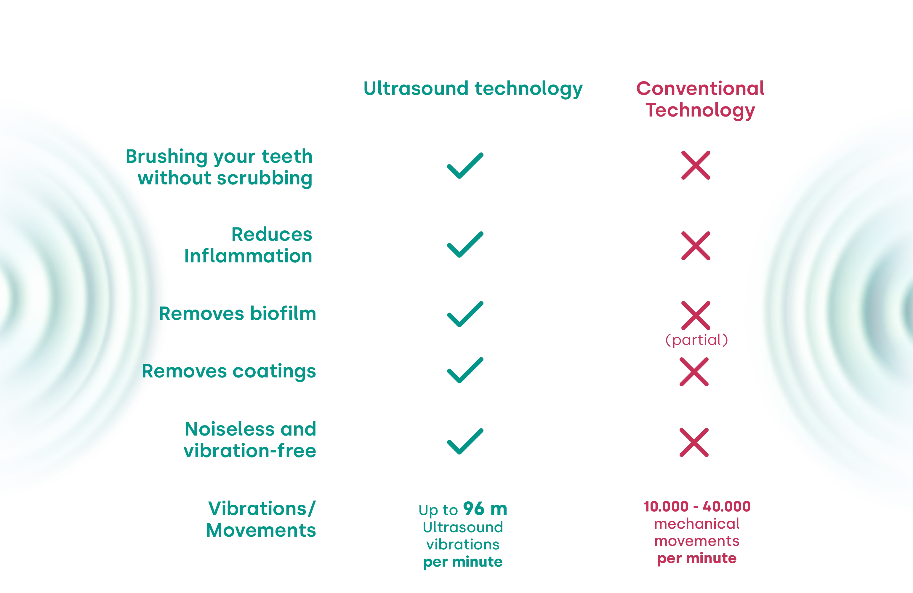 Toothbrushes that work with ultrasound have been revolutionizing toothbrushing since 2013. The key advantage over classic manual toothbrushes or electric toothbrushes is that ultrasonic toothbrushes work almost without contact and without mechanical movements. This makes cleaning particularly gentle and yet thoroughly reliable.