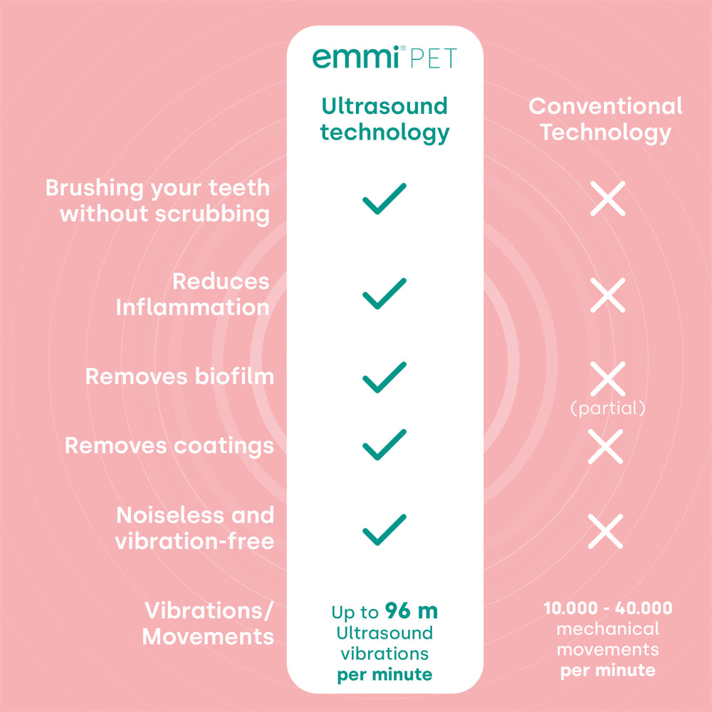 Finger cots and finger brushes only clean mechanically and often don't reach the gum pockets where bacteria accumulate. Especially in cases of gingivitis, finger cots rub against irritated gums and can worsen the inflammation. The emmi-pet ultrasonic toothbrush for dogs uses 100% ultrasound, providing a thorough deep cleaning – without any rubbing or pressure. This makes it particularly gentle on your dog's teeth and gums.