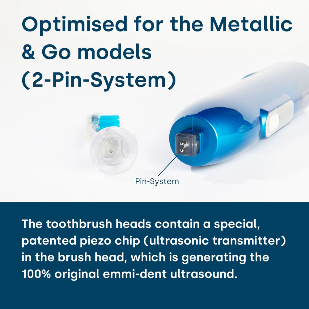 The ultrasonic brush head of the emmi-dent Ultrasonic toothbrushes contain a special, patented piezo chip (ultrasonic generator) in the brush head to generate the 100% original emmi-dent Ultrasound. In the sockets the emmi-dent Metallic and Go Ultrasonic brush heads have 2 hardened contact pins for connection to the emmi-dent Metallic and Go handpiece integrated. This innovation prevents jamming when plugging in and the ultrasonic brush head can be easily plugged in and removed.