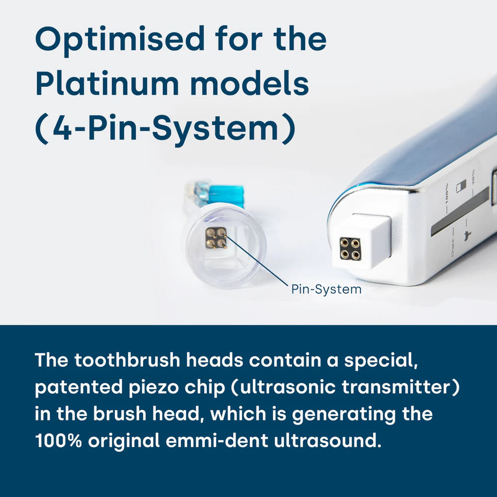 The ultrasound brush heads the emmi-dent Ultrasonic toothbrushes contain a special, patented piezo chip (ultrasonic generator) in the brush head to generate the 100% original emmi-dent Ultrasound. In the sockets of the emmi-dent Platinum Ultrasound brush heads 4 contact pins were used to connect to the emmi-dent Platinum handpiece integrated. This innovation prevents jamming when plugging in and the ultrasound brush heads can be easily attached and removed. In addition, thanks to the optimized ultrasonic timing, they are up to 4 times more effective than the brush heads the emmi-dent Metallic.